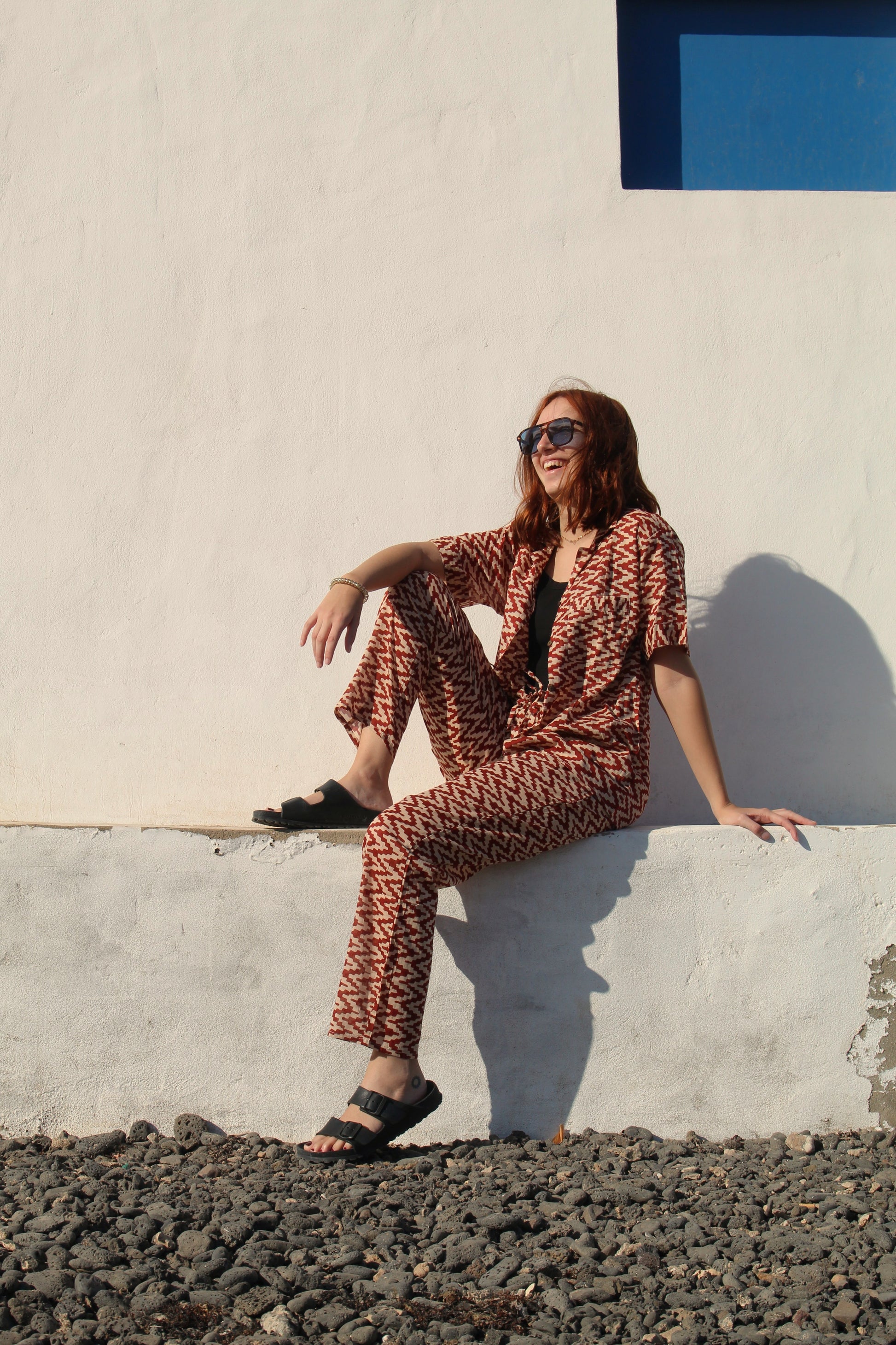This versatile set of long trousers and short sleeves shirt is crafted from 100% cotton and meticulously adorned with hand-printed unique designs.