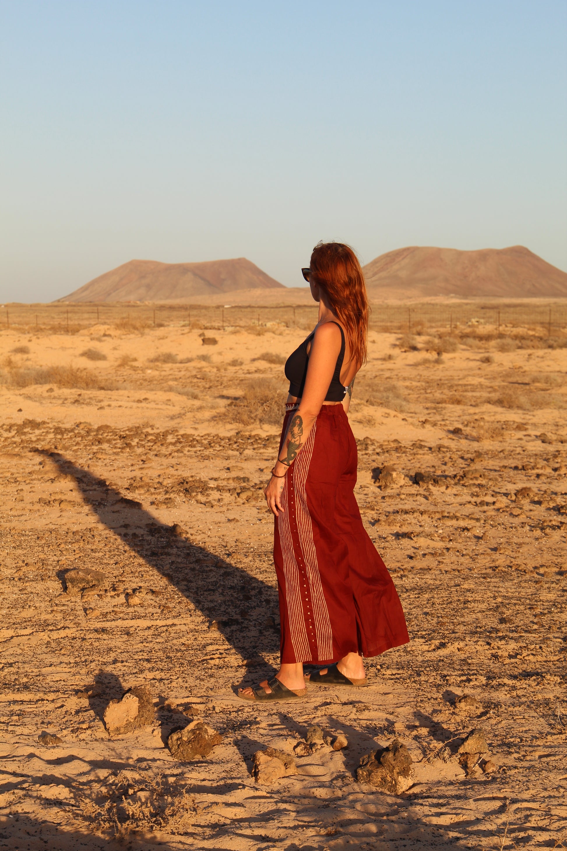~ The pants feature a very wide, palazzo-style leg with a cropped length. The elastic waistband at the back ensures a flexible fit, making them suitable for a variety of body types.